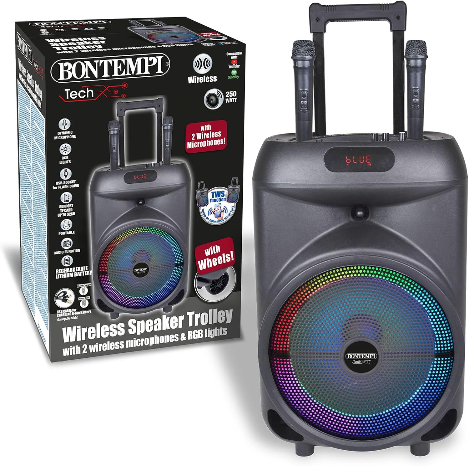 Bontempi Cassa Wireless con Trolley 2 Microfoni e luci RGB